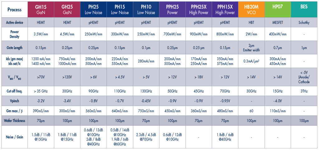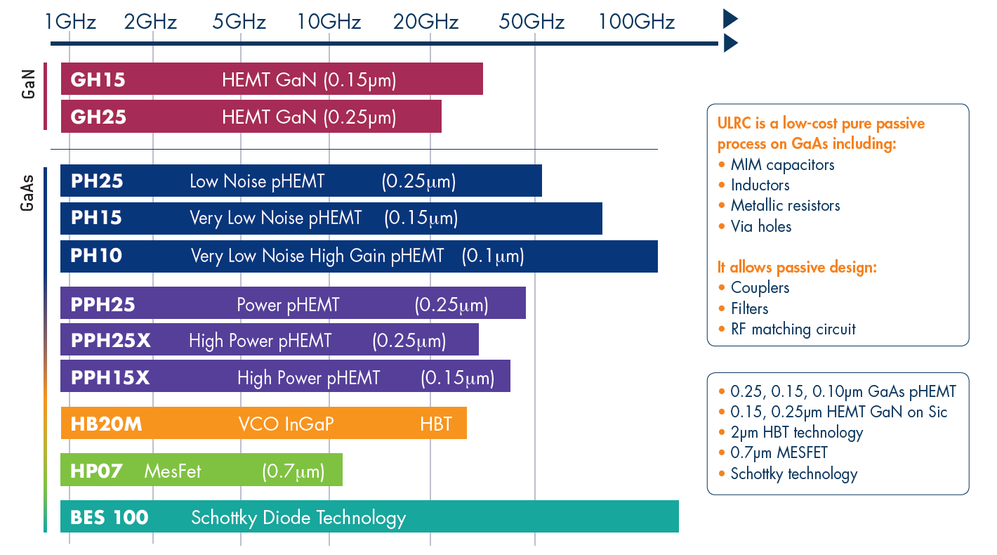Our pHEMT, HBT, Schottky diode and passive technologies, based on a high throughput 4-inch manufacturing line, are available in open foundry mode to offer our customers the capability to realise low noise or power MMIC solutions based on their own designs.
